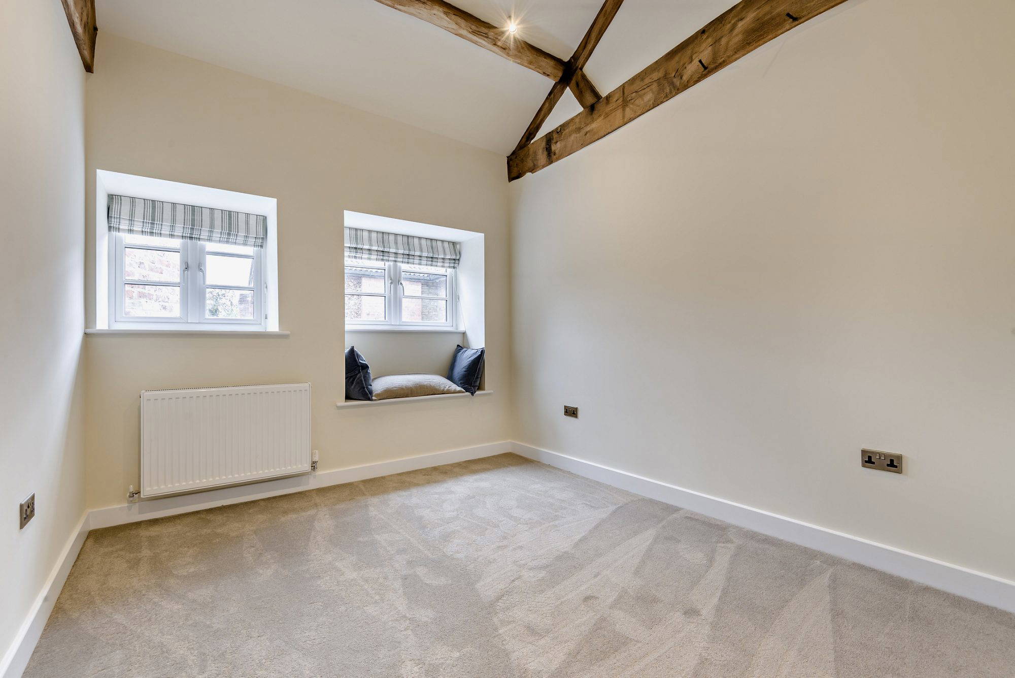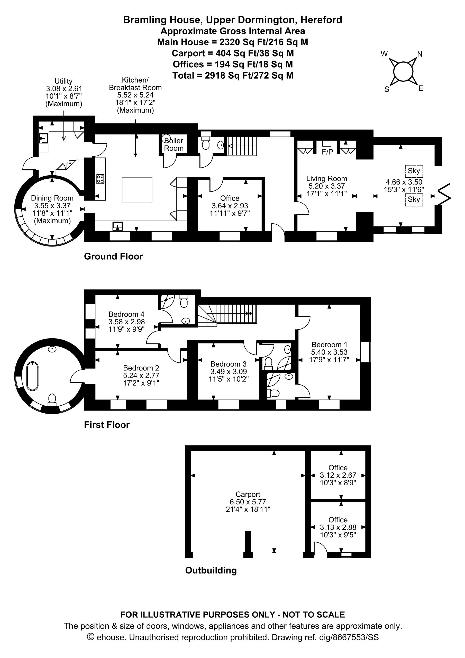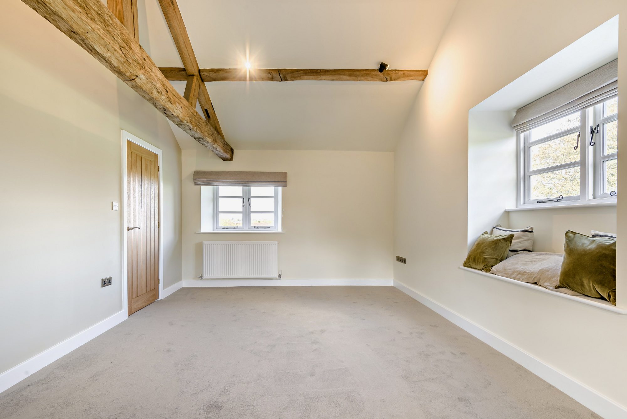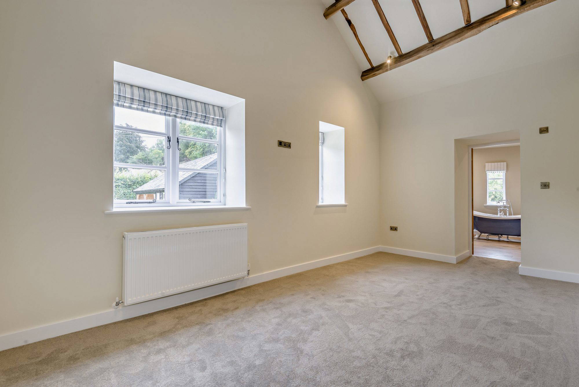 To the first floor, there are four good size bedrooms. The master bedroom with views over each elevation vaulted ceiling with exposed beams. There is an en-suite shower room. A further three Bedrooms one with en-suite shower room and a second which has the turret as its bathroom. This is a beautiful room which has a central feature slipper bath with shower attachment. High ceilings and exposed timbers throughout the top floor make this property feel light and airy throughout.