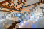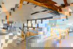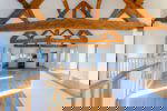 Upon entering there is a large glass walkway which opens out onto the rear courtyard. This walkway links the ground floor bedrooms (three in total) to the double vaulted living room with feature fireplace. From the inner reception hall, a timber staircase leads to the open plan family room. Undoubtably the hub of the home, this space offers far reaching views to both the front gardens, rear courtyard and countryside beyond. A number of glazed doors leading to balconies providing extensive across open countryside and the picturesque town of Ross on Wye. A dedicated office area has been created along with double doors that lead through to the mezzanine dining area. The newly fitted kitchen offers fabulous working space along with built in double oven, induction hob, integrated dishwasher and large integrated fringe/freezer. Moduleo floor and quartz worksurface complete this stylish but practical space.