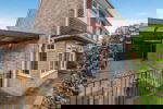 Beyond the patio is a lawned garden and small raised bed planting area.