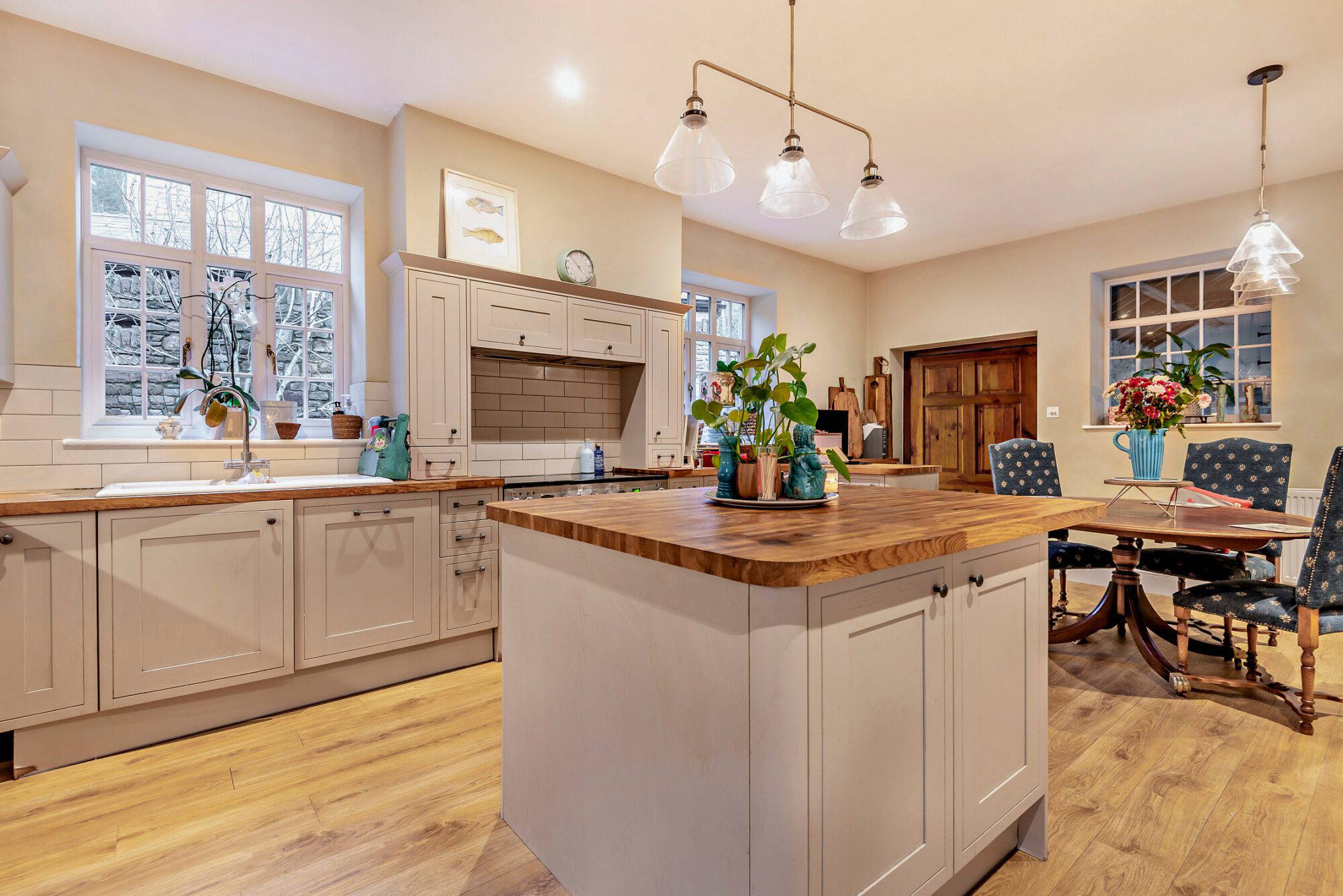 The Coach House has a large entrance hall with beautiful original floor tiling and wood panelling on the walls off which is a fitted cloakroom. The drawing room is a beautifully light characterful room with a high beamed ceiling and mahogany wood flooring. There is a good-sized dining room with direct access to the kitchen which is fitted with a range of matching units and modern appliances. On the first floor there are four characterful bedrooms and a family bathroom. Off the second entrance hall is a lobby/office which leads to a further sitting room, dining room and kitchen. Above this part of the accommodation is a further two bedrooms and a shower room.