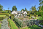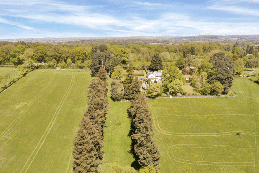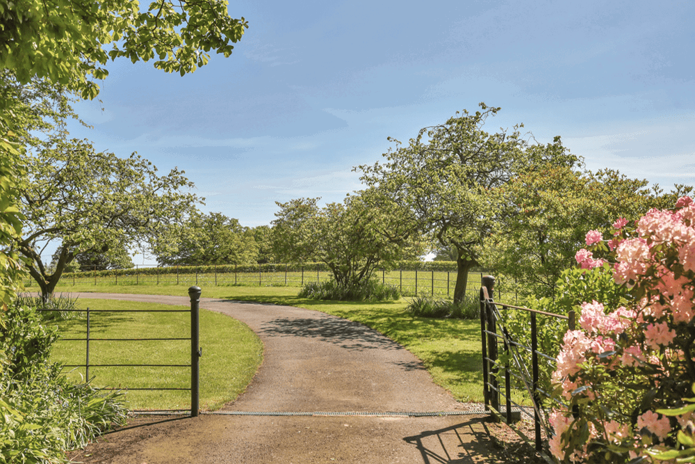 The gardens at The Twern extend to about 3.36 acres. The main entrance drive provides a most impressive approach, flanked by estate railings, mature trees and rhododendrons with pasture beyond, leading to the main gravelled courtyard and the front porch of the house. There is a good-sized parking area flanked by closely clipped hedges, raised borders, rockery and areas of lawn.