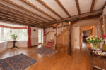 The accommodation of the main house is versatile and principally set over two floors. The main approach to the house from the front is welcoming, leading from an open porch, through arched double doors to a vestibule and then into an entrance hall with oak floor. This opens into a most attractive reception hall having a beamed ceiling, fireplace with woodburning stove, deep bay window and the oak main staircase.